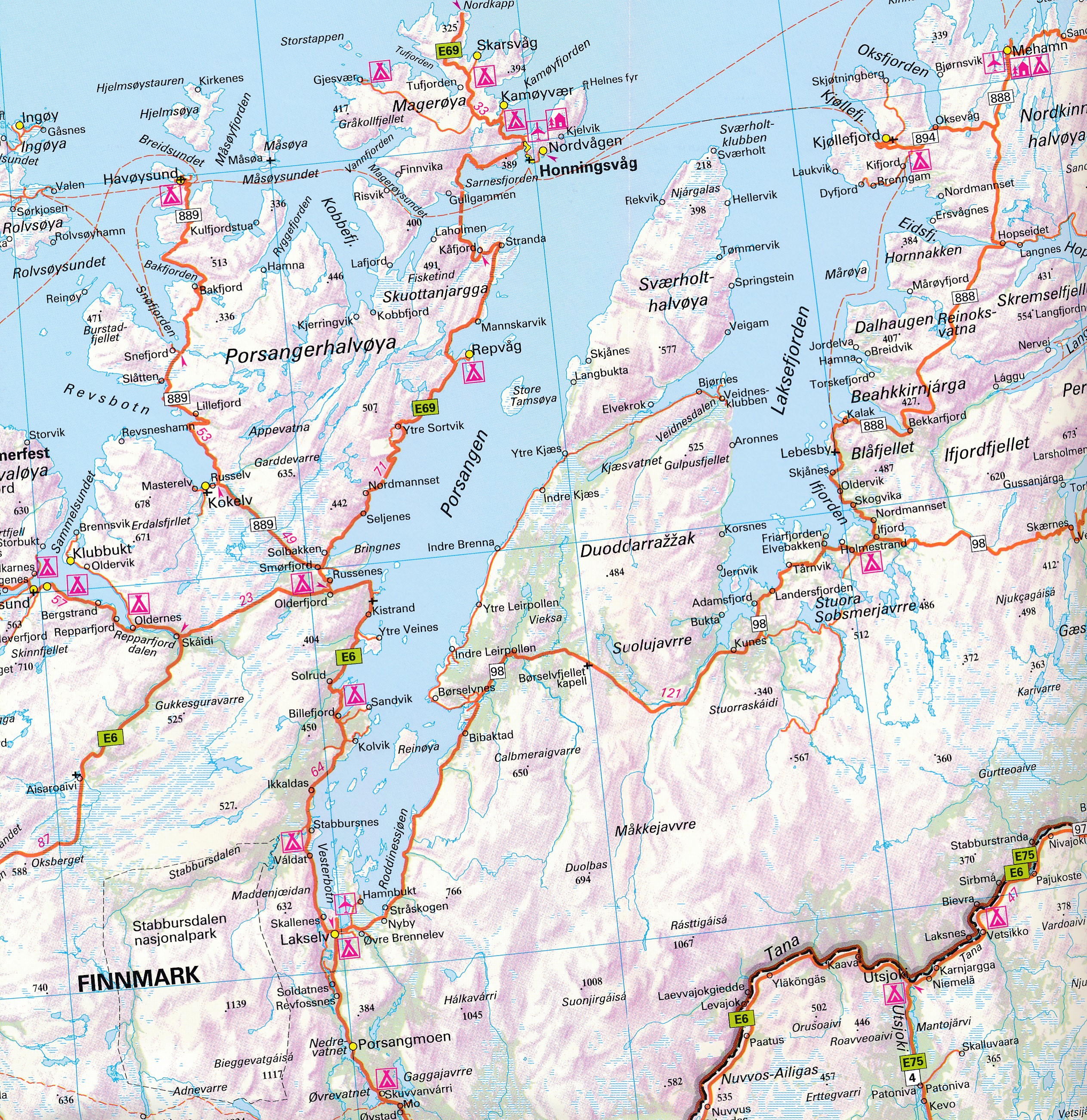 Bijzonder prettig leesbare kaart van Lapland - Noord Scandinavie. Naast het wegennet staan bijvoorbeeld campings heel duidelijk aangegeven. Ook jeugdherbergen, vliegvelden en havens worden met symbolen ingetekend.