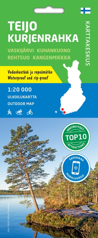 Teijo Kurjenrahka 1:20.000, buitenkaartDe buitenkaart Teijo Kurjenrahka 1:20.000 toont de populairste kampeerbestemmingen in Noord-Finland op een nauwkeurigere schaal dan voorheen. Naast de twee nationale parken (Teijo en Kurjenrahka) bevat het dubbelzijdige kaartblad kaarten van het Vaskijärvi natuurpark en andere delen van de Kuhankuono-wandelroute, allemaal op dezelfde schaal van 1:20.000 (1 cm op de kaart is 200 m in terrein). De buitenkaart is gedrukt op waterbestendig materiaal.