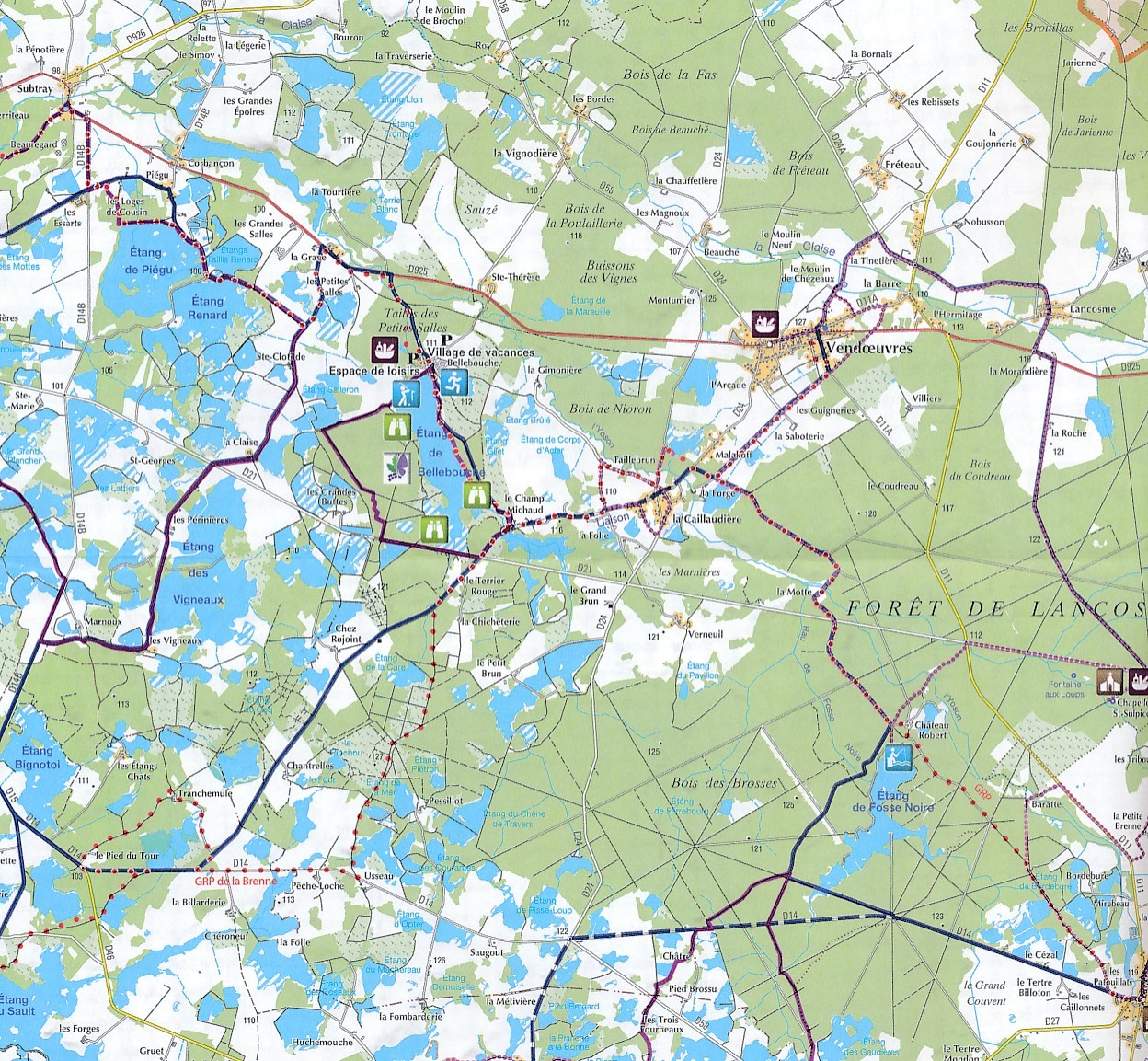 Duidelijke kaart van het regionale park La Brenne, een prachtig gebied met veel meertjes en watervogels. Bezienswaardigheden zijn ingetekend en ook zowel de doorgaande als kortere wandelroutes.