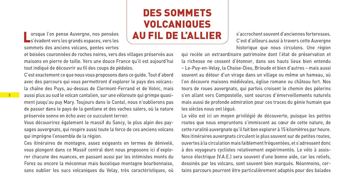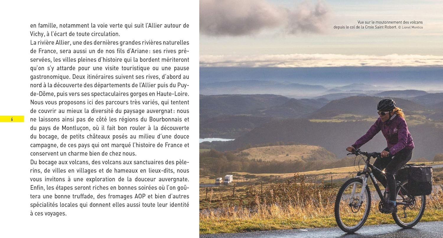 Les auteurs vous invitent à découvrir ce territoire de caractère, vaste et varié, au milieu de paysages d'exception depuis l'Allier et la Véloroute V70 jusqu'aux volcans du Cantal en passant par la Haute-Loire et le Puy-de-Dôme. Ils ont concocté des parcours sur mesure : dix itinéraires, essentiellement en boucle, de 2 à 4 jours, et de nombreuses variantes. Au total, ce ne sont pas moins de 1500 km avec des trajets qui vont d'une centaine de kilomètres le temps d'un week-end, à un peu plus de 250 km à envisager sur une petite semaine.