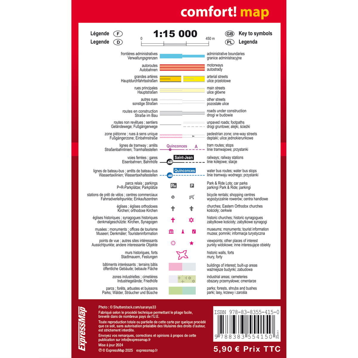 Bordeaux ExpressMap mini 1/15000ExpressMap is de uitgever van comfort! maps, geplastificeerde kaarten die eenvoudig te vouwen zijn, zelfs met één hand. Een uniek en innovatief product. Comfortabel, waterbestand, onverscheurbaar, comfort! maps blijven hun kwaliteit lang behouden. Duurzame kaarten, nuttig om een uitstap te plannen en handig voor onderweg.