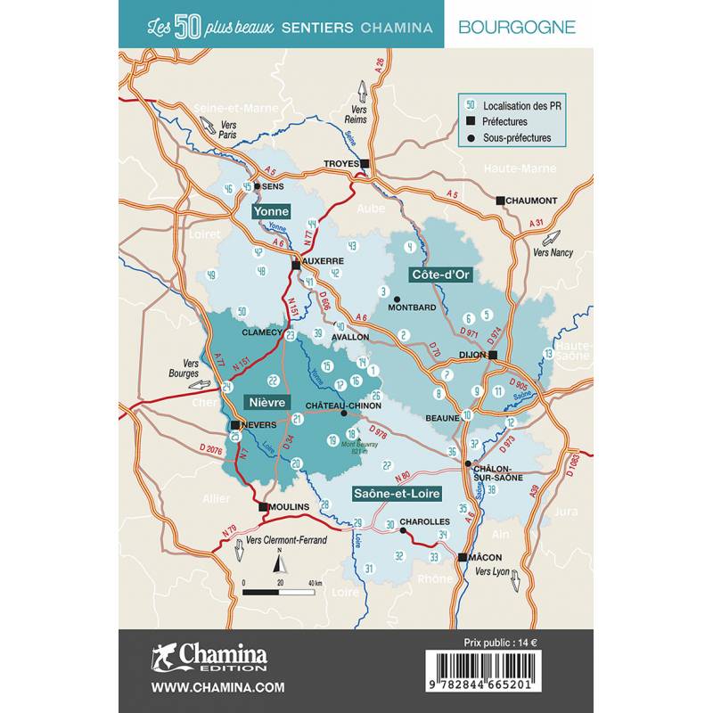 La collection "50 Plus Beaux" change de charte ! Le guide : Les 50 plus beaux sentiers Chamina en Bourgogne, pour arpenter à pied les circuits de randonnée de cette région historique, façonnée par les ducs de Bourgogne. Situés sur l'axe Lyon-Paris, les quatres départements bourguignons (Nièvre, Yonne, Côted'Or,Saône-et-Loire) dont le point de convergence est le Parc naturel régional du Morvan, donnent à voir (et à boire !) une large palette de paysages et de terroirs.Auteur(e)(s) : Collectif Points forts :• Chamina fait peau neuve : nouvelles couverture et présentation intérieure !• 50 itinéraires de longueur variable pour une pratique familiale et sportive • Cartographie sur fond IGN au 1 : 25 000 pour se repérer facilement • Détail des centres d’intérêts • Renseignements pratiques et adresses utiles.