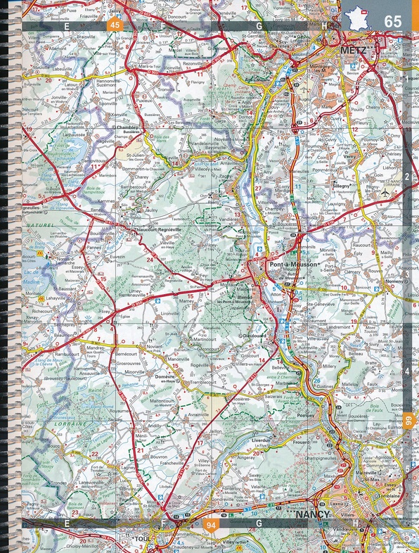 Frankrijk Wegenatlas, ringband, schaal 1 : 200.000. Met uitgebreide plaatsnamenindex, afstandentabel, stadsplattegronden en uitgebreide legenda voor o.a. aanduiding hellingspercentages voor fietsen of camper of caravan.