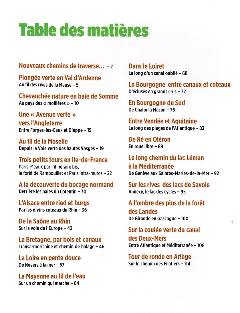 Dit boekje biedt een uitgebreid overzicht van vele 'voies vertes' (fietspaden over verlaten spoorwegen of jaagpaden) en overige fietsroutes over fietsvriendelijke weggetjes en paden in Frankrijk. Voor de samenstelling van het overzicht werd kritisch gekeken naar o.m. de kwaliteit van het wegdek, de aantrekkelijkheid van de omgeving, de staat van de markering, enzovoorts. Van alle routes wordt een korte karakteristiek gegeven en wordt verwezen naar websites en VVV-adressen voor kaarten en gidsjes. Het boekje biedt verder overzichtskaarten voor de ligging van de diverse routes. Het is ingedeeld per regio (Bourgogne, Provence, Bretagne, etc.).