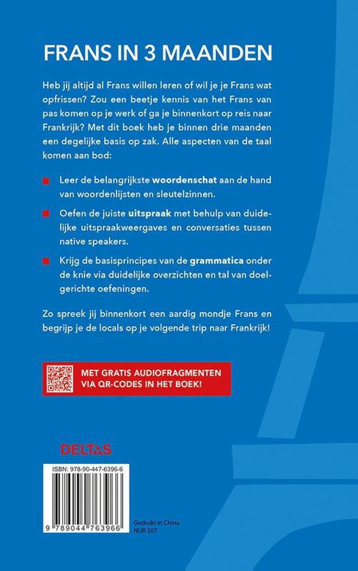 LEER FRANS IN 3 MAANDEN Heb jij altijd al Frans willen leren of wil je je Frans wat opfrissen? Zou een beetje kennis van het Frans van pas komen op je werk of ga je binnenkort op reis naar Frankrijk? Met dit boek heb je binnen drie maanden een degelijke basis op zak. Alle aspecten van de taal komen aan bod: - Leer de belangrijkste woordenschat aan de hand van woordenlijsten en sleutelzinnen. - Krijg de basisprincipes van de grammatica onder de knie via duidelijke overzichten en tal van doelgerichte oefeningen. - Oefen de juiste uitspraak met behulp van duidelijke uitspraakweergaves en conversaties van native speakers (audiofragmenten te downloaden via QR-codes) Zo spreek je binnenkort een aardig mondje Frans en begrijp je de locals op je volgende trip naar Frankrijk!