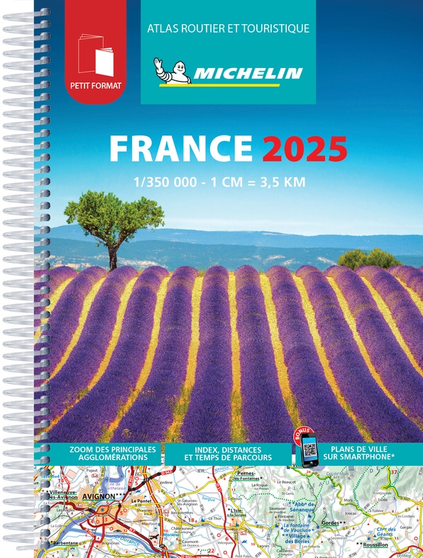 Klein formaat (A5, 17 x 23 cm) van de Atlas Routier et Touristique 2024 handig in gebruik door het formaat en ook nog in een ringband. Door het kleine formaat worden de lettertjes wat kleiner. Schaal is ook iets minder gedetailleerd: 1:350.000. Met register en stadsplattegronden.