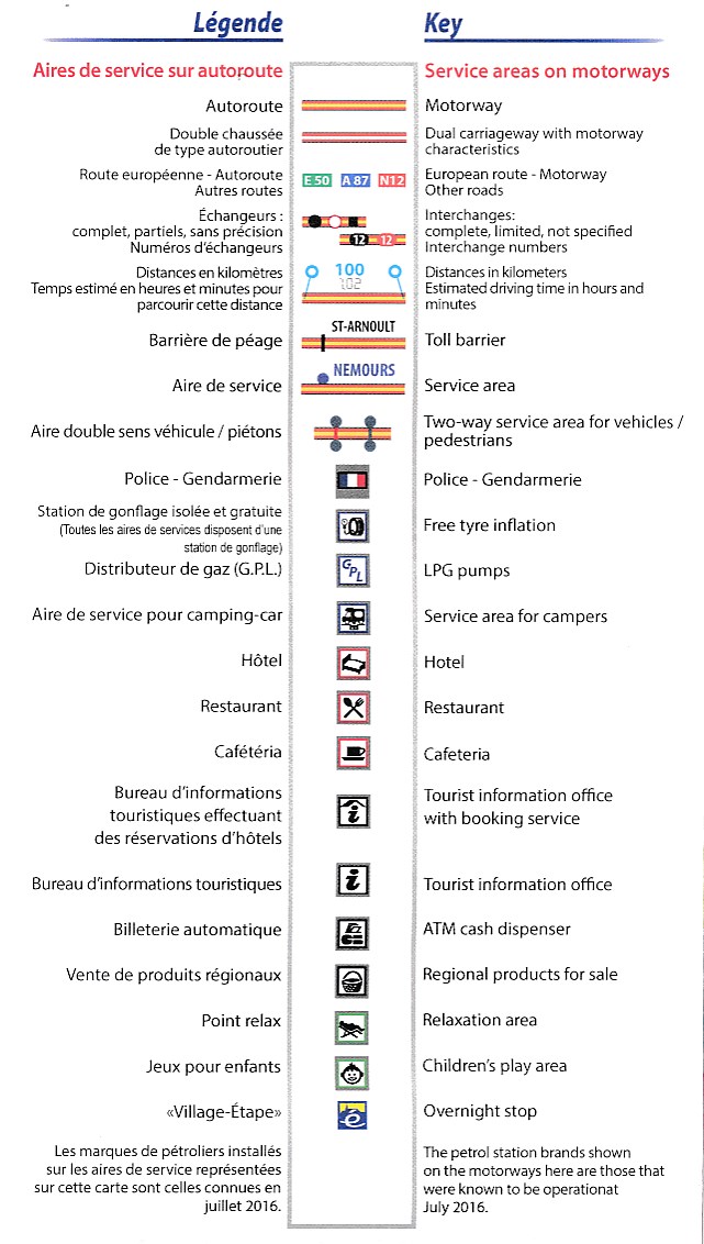Handige overzichtskaart van Frankrijk, helemaal toegespitst op de Aires de Service langs de snelwegen. voor iemand die vaker of langer op de Franse autoroutes rondrijdt, is dit een handige kaart. Met afstanden en welke voorzieningen waar te vinden zijn.