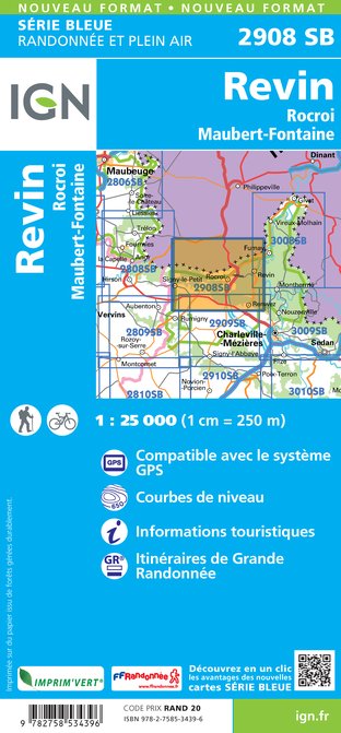 - Wandelkaart - Topografische kaart 2908 SB - Serie Bleue Revin, Rocroi, Maubert-Fontaine | IGN - Institut Géographique National