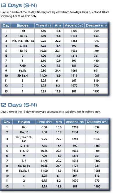 15 different itineraries: schedules of 9, 10, 11, 12, 13, 14, 15 and 16 days. Includes both northbound and southbound itineraries. Difficult calculations of time, distance and altitude gain are done for you.