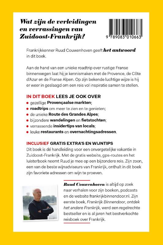 Wat zijn de verleidingen en verrassingen van Zuidoost-Frankrijk? Het antwoord wordt door Frankrijkkenner Ruud Couwenhoven in dit boek gegeven. Aan de hand van een unieke roadtrip over rustige Franse binnenwegen laat hij je kennismaken met de Provence, de Côte d’Azur en de Franse Alpen. Op zijn bekende luchtige wijze is hij er weer in geslaagd om een reis vol inspiratie samen te stellen. IN DIT BOEK LEES JE OOK OVER gezellige Provençaalse markten; roadtrips om meer te zien en te genieten; de unieke Route des Grandes Alpes; bijzondere wandelingen en fietstochten; verrassende insidertips van locals; leuke restaurants en overnachtingsadressen Iclusief gratis extra’s en wijntips: Dit boek is dé handleiding voor een onvergetelijke vakantie in Zuidoost-Frankrijk. Met de gratis website, gps-routes en het luisterboek neemt Ruud je mee op een bijzondere reis. Zijn zoon, een van de beste wijnadviseurs van Frankrijk, onthult in dit boek zijn favoriete adressen om wijn te proeven. Ruud Couwenhoven is altijd op zoek naar verhalen voor zijn boeken, podcasts en de website frankrijkbinnendoor.nl. Zijn eerste boek, Frankrijk Binnendoor, ontdek het andere Frankrijk, is al jaren het bestverkochte reisboek over Frankrijk.