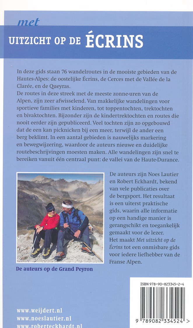 Met uitzicht op de Écrins is een bergwandelgids met 76 dagtochten (waaronder een groot aantal toppentochten) en 5 meerdaagse bergwandelingen in de Hautes-Alpes (Frankrijk). Formaat, opzet en indeling zijn hetzelfde als van de in 2009 verschenen gidsen Tour du Mont Blanc en Met uitzicht op de Mont Blanc. Het thema is deze keer 'uitzicht op het Massif des Écrins', een van de indrukwekkendste berggebieden van de Alpen. In de praktijk betekent dit dat de wandelaar tijdens elke tocht minimaal éénmaal zicht heeft op de hoge bergen en witte gletsjers van dit magnifieke gebergte. De auteurs zijn Noes Lautier, die ruim 18 jaar eindredacteur van het buitensportblad Op Pad is geweest, en Robert Eckhardt, bekend als alpinist en fotograaf. Beiden hebben zeer ruime ervaring in de bergsport én in het beschrijven van wandeltochten. In de zomers van 2010 en 2011 hebben Noes Lautier en Robert Eckhardt alle tochten gelopen en beschreven. Zij hebben in totaal 67.880 meter gestegen en 90 toppen beklommen.