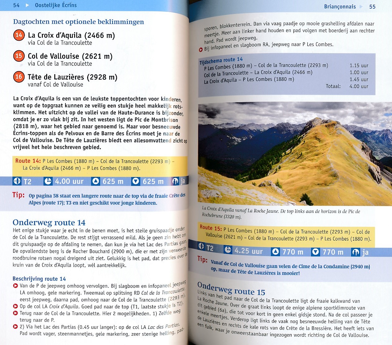 De gids is ingedeeld in 3 gebieden: Vallée de la Clarée en Cerces, Oostelijke Écrins, en Queyras, wandelgebieden bij uitstek. In één hoofdstukje staan vaak meerdere routes. Bijvoorbeeld: een makkelijke wandeling heen-en-weer naar een meer (bijv. route 7), de beklimming van een berg vanaf dat meer (route 9) en via een andere weg terug naar het beginpunt (route 8). Dat heeft een groot aantal kindertochten opgeleverd, maar ook ruige tochten door gebieden waar weinig mensen komen en nieuwe wandelingen die nooit eerder beschreven zijn, zoals de Tour de Montbrison (route 18). De moeilijkheidsgraad is in de tekst in een pictogrammenbalkje weergegeven en op de kaartjes met een kleur. NIEUW t.o.v. alle andere (buitenlandstalige) gidsjes over de Hautes-Alpes zijn het thema (tijdens elke tocht zicht op de Écrins), de omvang van het beschreven gebied, de nooit eerder beschreven routes en het feit dat dit grote gebied vanuit één centraal punt te bereiken is, namelijk de vallei van de Haute-Durance met de plaatsen Argentière-la-Bessée en het gehucht Champcella.