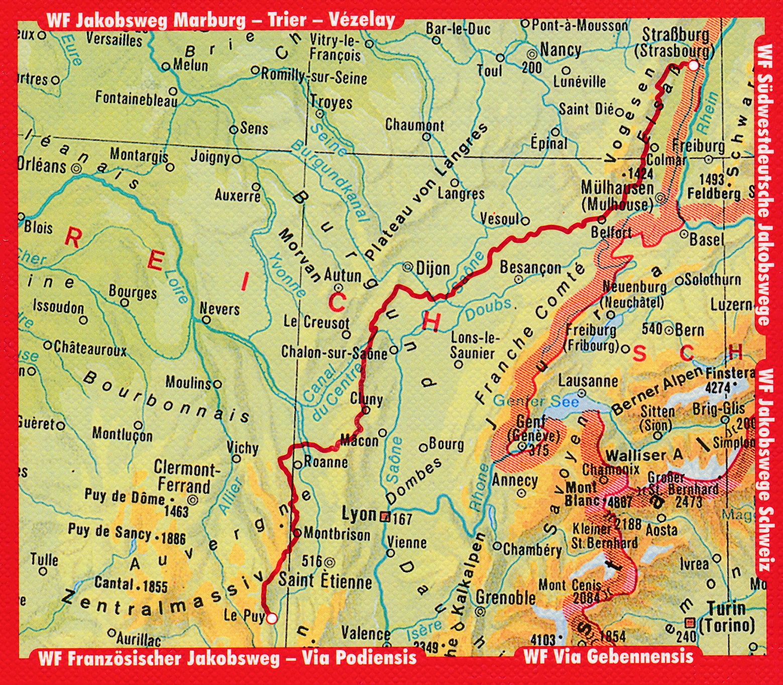 Zunächst wird das lebensfrohe Elsass mit seinen mittelalterlich anmutenden Winzerorten durchquert. Hübsch dekorierte Fachwerkhäuser schmiegen sich eng aneinander und viele Weinstuben locken zur Einkehr. Ein kultureller Höhepunkt im wahrsten Sinne des Wortes ist hier der bekannte Odilienberg, auf dem schon seit Jahrhunderten Pilger übernachten. Thann ist ein alter Pilgertreff- und Sammelpunkt, auch heute noch mündet der Jakobsweg aus dem süddeutschen Raum auf der Rue des Pélerins ein. Nach Belfort zieht der Weg durch die weiten Berglandschaften mit den großflächigen Waldgebieten der Franche-Comté. Hier kann man die Seele baumeln lassen sowie Ruhe und Einsamkeit finden. In Burgund ist man in den berühmtesten Weinberglagen der Welt unterwegs und berührt so bekannte Orte wie Vougeot, Nuits-St-Georges, Meursault und Chassagne-Montrachet. Auch das im Mittelalter bedeutende geistige Zentrum Cluny zieht die Aufmerksamkeit der Pilger auf sich. Über aussichtsreiche Höhenlagen mit großartigen Fernsichten im Gebiet der Rhône-Alpes und der Auvergne rückt das Ziel dieses über 800 Kilometer langen Jakobsweges näher, Le Puy-en-Velay, in dessen Stadtbild Pilger nun überall präsent sind.