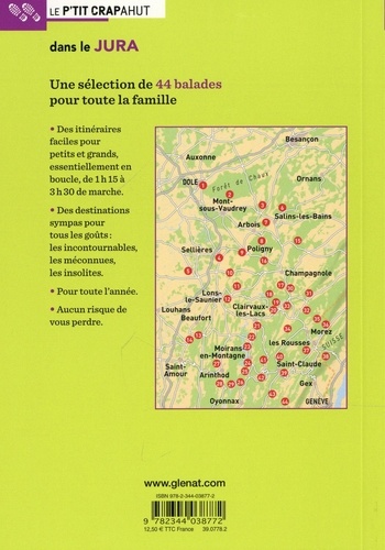 30 balades pour toute la famille dans le département du Jura.Au cœur du massif du même nom, le département du Jura se décline tel un escalier naturel menant graduellement de la plaine à la montagne. Au fil des saisons, on trouvera par conséquent toujours une balade à son pied, cela même quand les plateaux et les forêts d'altitude sont enneigés. Les 30 balades de ce P'tit Crapahut ont été soigneusement sélectionnées afin de permettre la découverte d'un territoire attrayant et de sites réputés, telles que les cascades du Hérisson, Château-Chalon et la reculée de Baume-les-Messieurs, mais aussi de nombreux autres lieux riches de particularités paysagères, biologiques ou historiques dont on ne soupçonne pas toujours l'existence. Les forêts, les lacs, les rivières, les cascades et les belvédères sont évidemment les destinations les plus nombreuses, mais on trouvera également un circuit urbain au cœur de la ville de Dole, l'ancienne capitale de la Franche-Comté, ainsi qu'un original sentier de découverte des savoir-faire artisanaux du Haut-Jura.