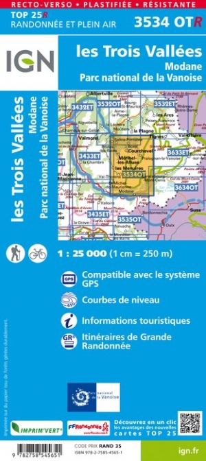 L'indispensable carte de randonnée IGN 3534OTR. D'une très grande précision elle contient tous les détails existants sur le terrain : voies de communication jusqu'au moindre sentier, constructions jusqu'au hangar, bois, arbre isolé, rivière, source... Sans oublier la représentation du relief par des courbes de niveau. Les sentiers balisés et les informations touristiques sont également représentées.