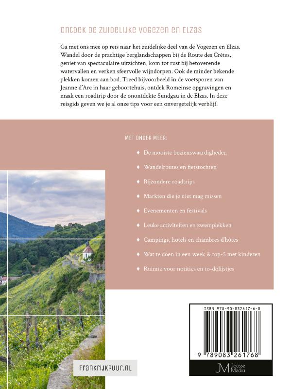 Ga met ons mee op reis naar het zuidelijke deel van de Vogezen en Elzas. Wandel door de prachtige berglandschappen bij de Route des Crêtes, geniet van spectaculaire uitzichten, kom tot rust bij betoverende watervallen en verken sfeervolle wijndorpen. Ook de minder bekende plekken komen aan bod. Treed bijvoorbeeld in de voetsporen van Jeanne d’Arc in haar geboortehuis, ontdek Romeinse opgravingen en maak een roadtrip door de onontdekte Sundgau in de Elzas. In deze reisgids geven we je al onze tips voor een onvergetelijk verblijf. Met onder meer: - De mooiste bezienswaardigheden - Wandelroutes en fietstochten - Bijzondere roadtrips - Markten die je niet mag missen - Evenementen en festivals - Leuke activiteiten en zwemplekken - Campings, hotels en chambres d’hôtes - Wat te doen in een week & top-5 met kinderen - Ruimte voor notities en to-dolijstjes