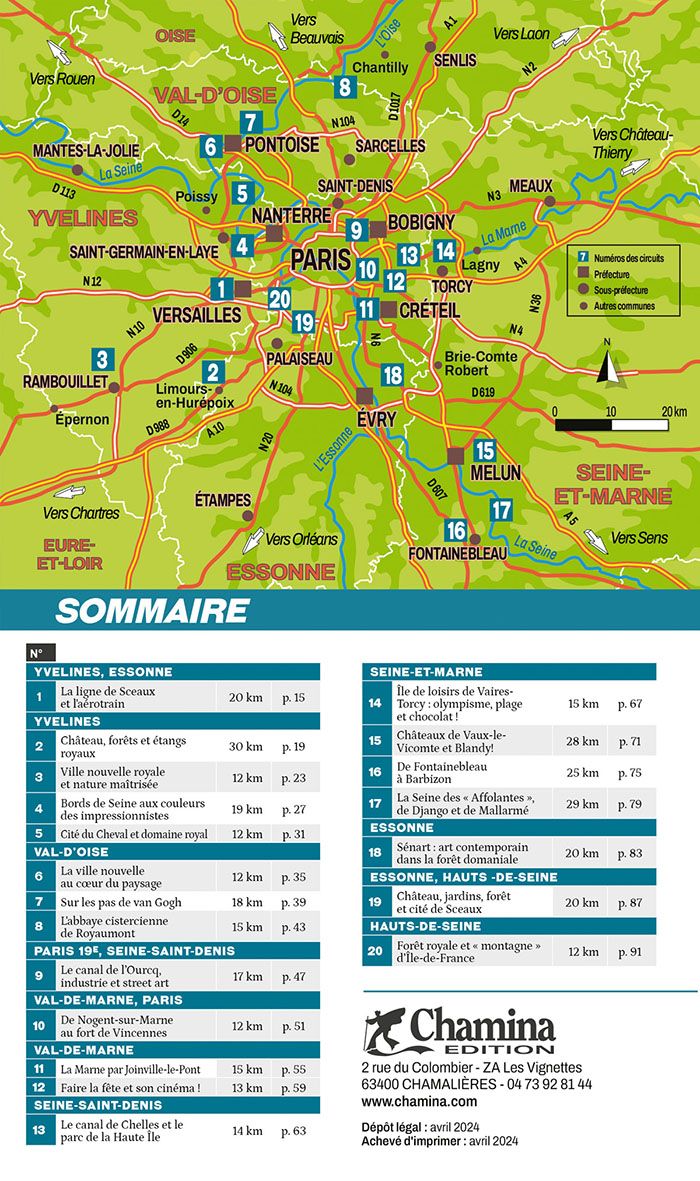 Vous résidez en Ile-de-France et désirez profiter de la région en pédalant ? Ce guide est fait pour vous. Marcolino da Costa a arpenté les pistes cyclables et les routes du territoire afin de créer 20 boucles à vélo, chacune faisant entre 12 et 30 km. Toutes les balades partent dune gare de RER, Transilien, ou TER au départ de Paris afin dy accéder facilement. De plus, chaque circuit est agrémenté de 2 textes patrimoniaux apportant un éclairage sur les intérêts présents au fil de leau.