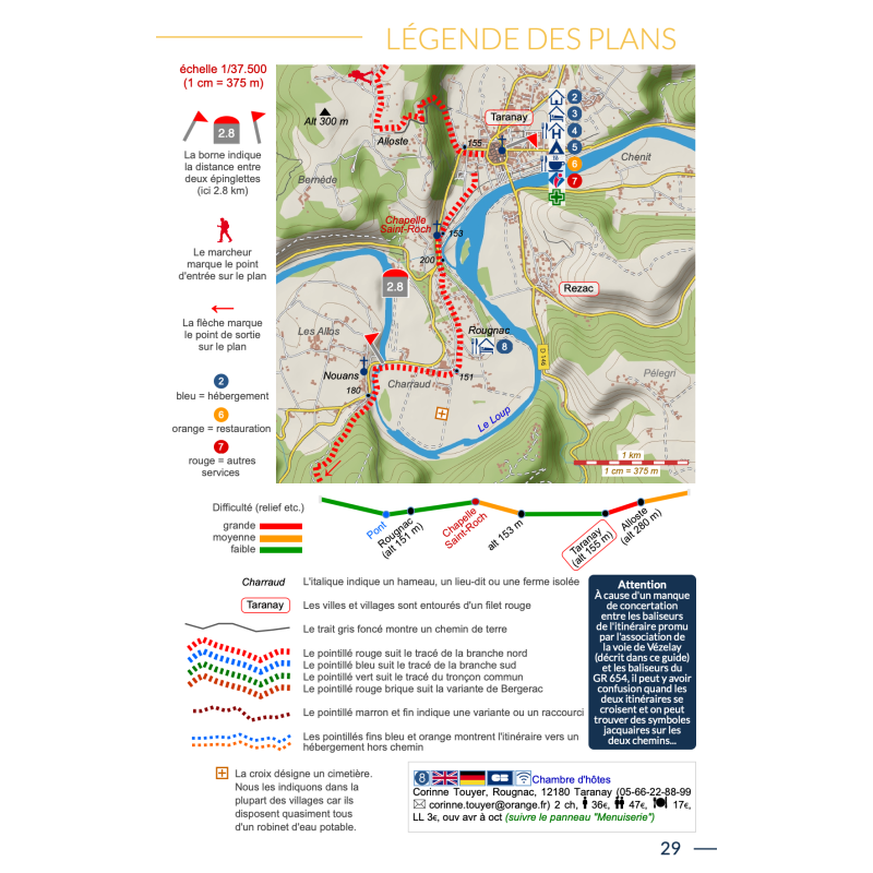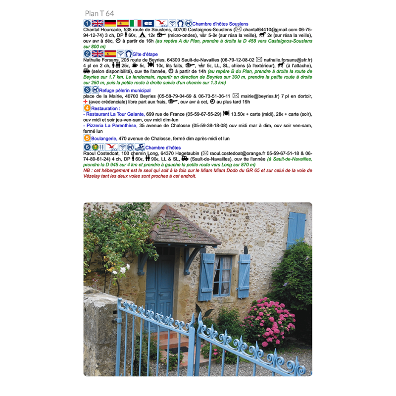 De uitgebreid in het Frans beschreven adressen (met prijzen en condities) van restaurants, cafe's en slaapplekken, zoals kloosters, herbergen, gastverblijven en campings liggen allen binnen een straal van 5km van de wandelroute. De gids geeft ook andere praktische informatie zoals adressen van postkantoren, apotheken, banken, etc.