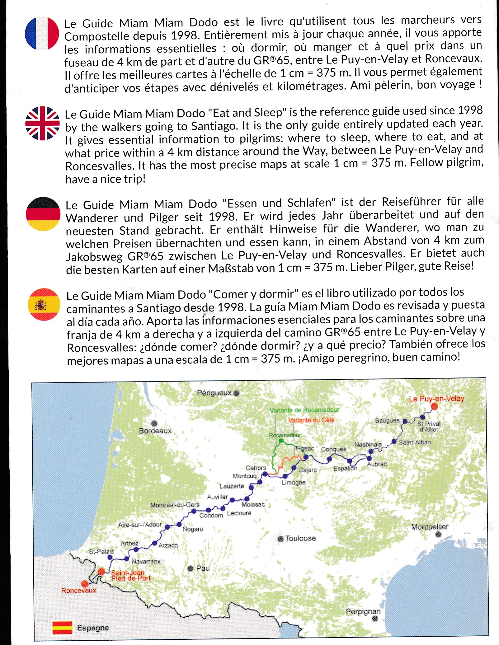 Toonaangevende Franstalige wandelgids met zowel de route, kaarten en praktische informatie. Met een overzicht van de eetadressen en overnachtingsadressen langs het lange afstandswandelpad GR 65 Cahors naar Roncevaux. De uitgebreid in het Frans beschreven adressen (met prijzen en condities) van restaurants, cafe's en slaapplekken, zoals kloosters, herbergen, gastverblijven en campings liggen allen binnen een straal van 5km van de wandelroute GR 65. De gids geeft ook andere praktische informatie zoals adressen van postkantoren, apotheken, banken, bakkers en slagers, etc.