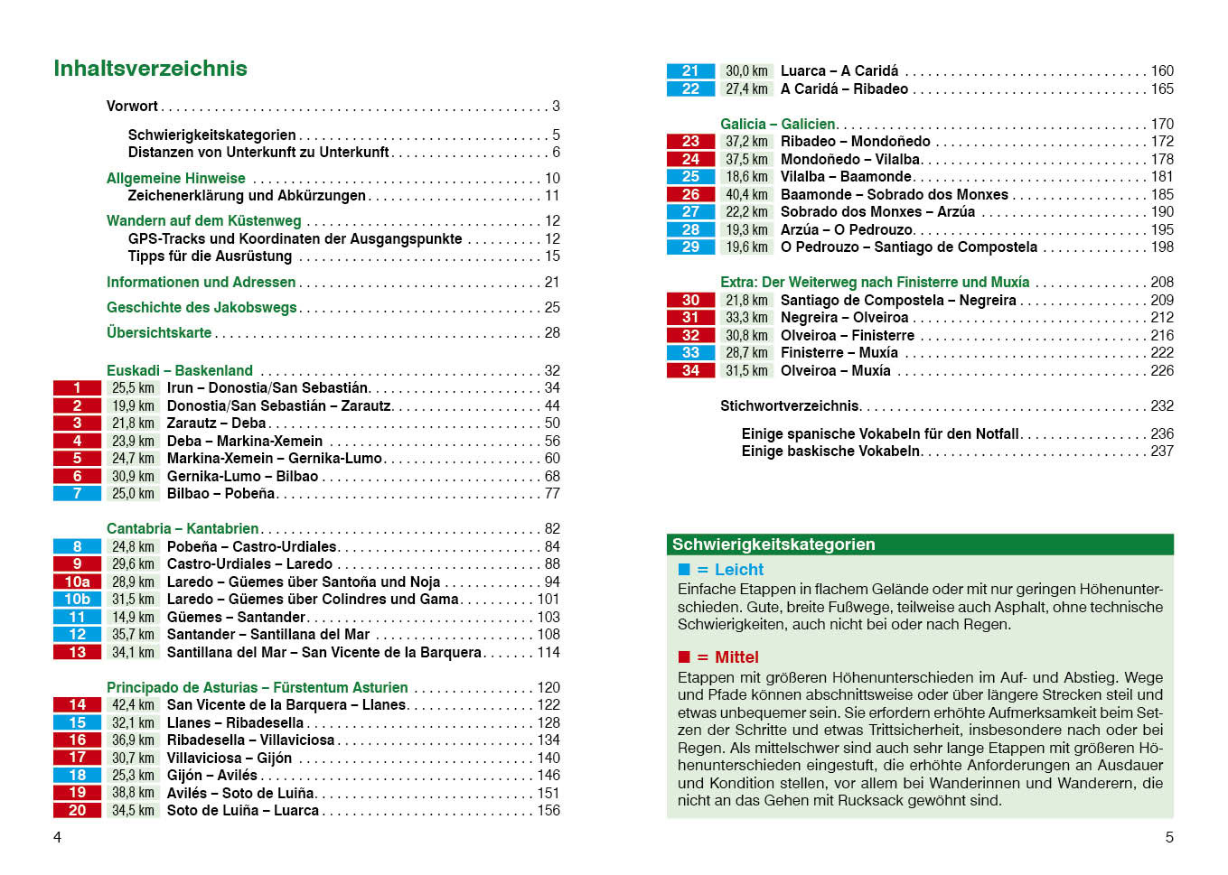 Von Irun bis nach Santiago de Compostela – und optional weiter bis Finisterre und Muxía – beschreibt der Pilgerführer die Route in 34 detaillierten Etappen. Jede Tagesetappe ist präzise beschrieben, mit farbigen Wanderkarten, aussagekräftigen Höhenprofilen und zahlreichen hilfreichen Tipps für unterwegs. Ob Herbergen, alternative Unterkünfte, Infrastruktur oder Hinweise zur Pilgerausrüstung – dieser Pilgerführer lässt keine Fragen offen.