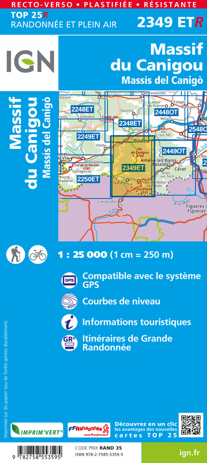 L'indispensable carte de randonnée IGN 2349ETR. D'une très grande précision elle contient tous les détails existants sur le terrain : voies de communication jusqu'au moindre sentier, constructions jusqu'au hangar, bois, arbre isolé, rivière, source... Sans oublier la représentation du relief par des courbes de niveau. Les sentiers balisés et les informations touristiques sont également représentées.