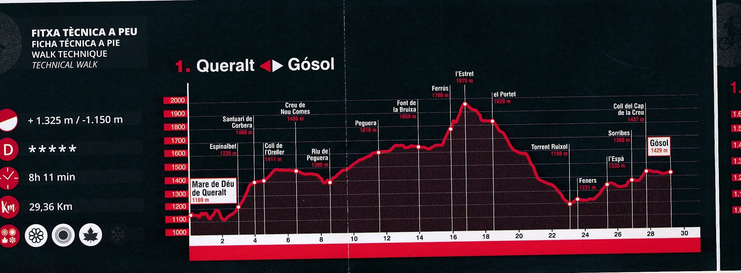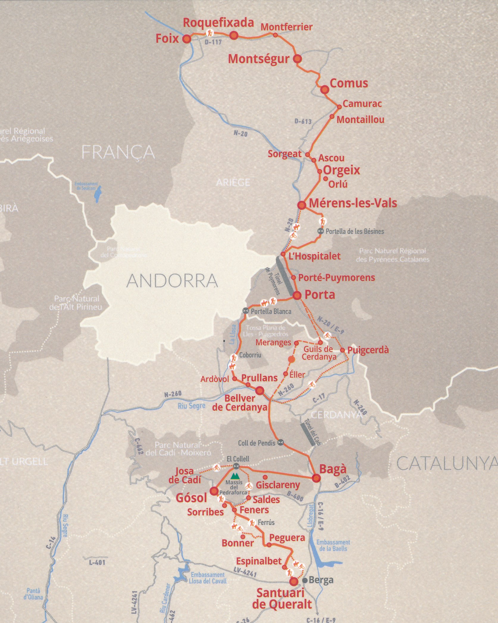 Berga, Santuari de Queralt, Peguera, Bonner, Gosol, Baga, Bellver de Cerdanya, Prullans, Puigcerdà, Porta, L'Hospitalet, Mérens-les-Vals, Orgeix, Comus, Montségur, Roquefixada, Foix