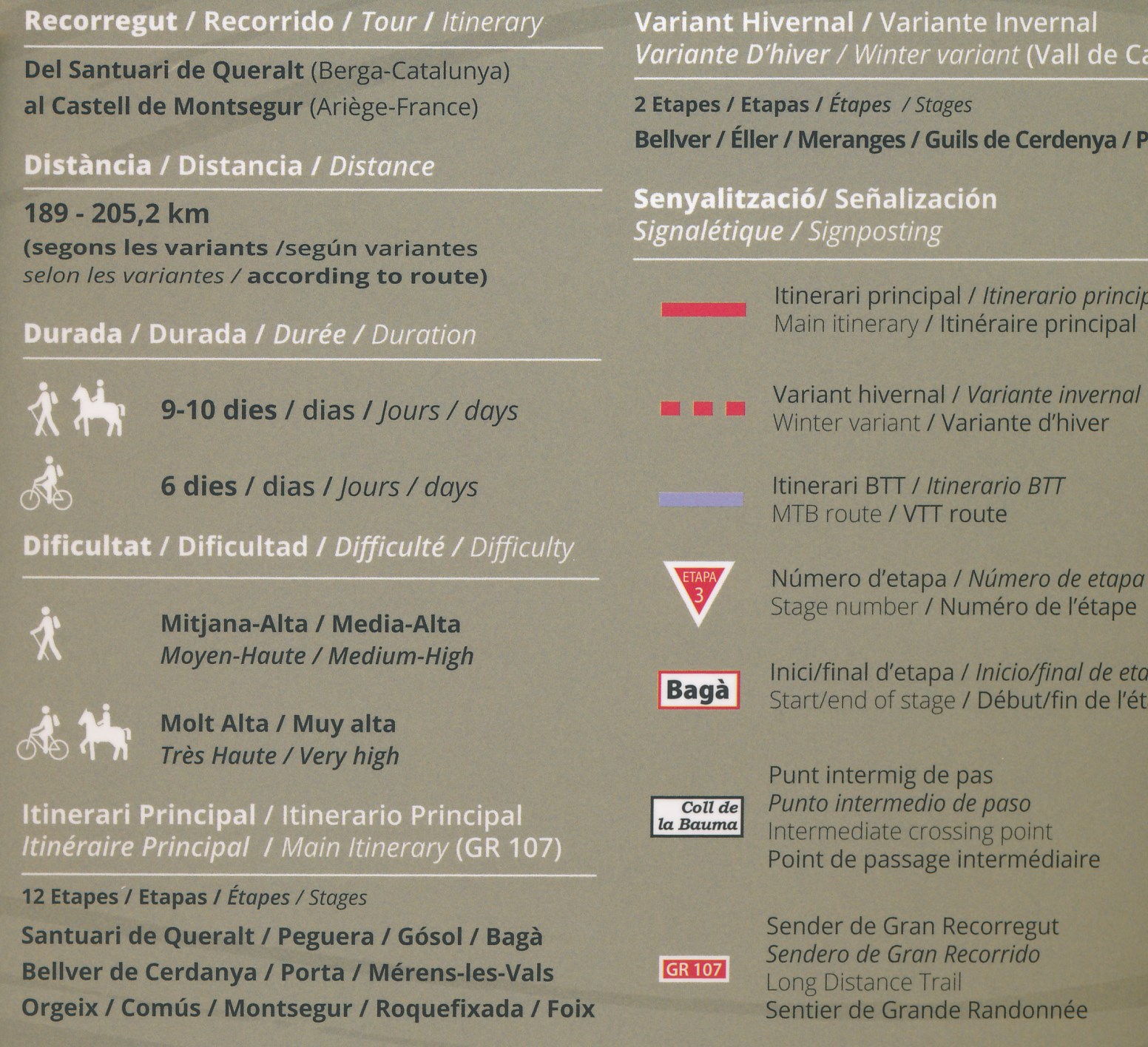 Uitstekende wandelkaart (in een set met 6 deelkaarten) van de GR107 die loopt van Foix in de Franse Pyreneeen tot Berga in de Catalaanse Pyreneeen. De kaarten zijn voldoende gedetailleerd om deze lange route te lopen. Met hoogteprofielen aan de zijkant, symbolen voor de noodzakelijke praktische informatie.