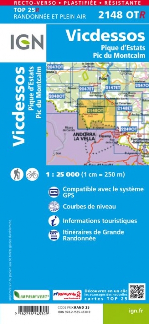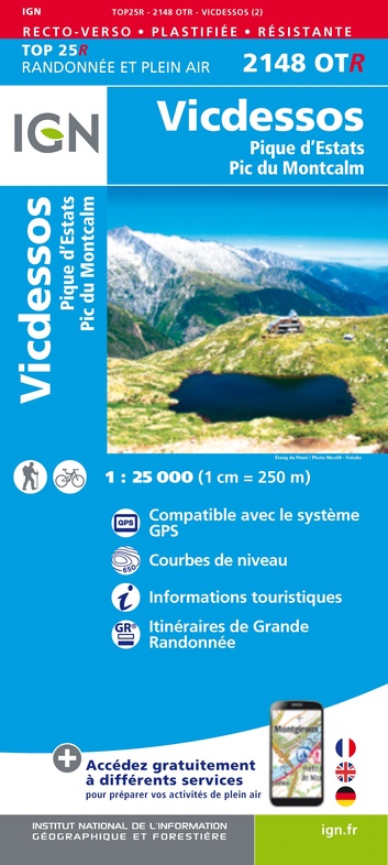 L'indispensable carte de randonnée IGN 2148OTR. D'une très grande précision elle contient tous les détails existants sur le terrain : voies de communication jusqu'au moindre sentier, constructions jusqu'au hangar, bois, arbre isolé, rivière, source... Sans oublier la représentation du relief par des courbes de niveau. Les sentiers balisés et les informations touristiques sont également représentées.
