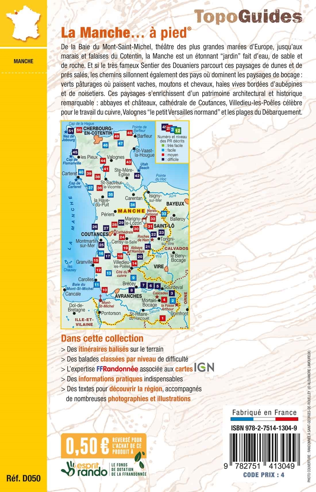 La Manche... à pied. De la Baie du Mont-Saint-Michel, théâtre des plus grandes marées d'Europe, jusqu'aux marais et falaises du Cotentin, la Manche est un étonnant "jardin" fait d'eau, de sable et de roche. Et si le très fameux Sentier des Douaniers parcourt ces paysages de dunes et de prés salés, les chemins sillonnent également des pays où dominent les paysages de bocage : verts pâturages où paissent vaches, moutons et chevaux, haies vives bordées d'aubépines et de noisetiers. Ces paysages s'enrichissent d'un patrimoine architectural et historique remarquable : abbayes et châteaux, cathédrale de Coutances, Villedieu-les-Poêles célèbre pour le travail du cuivre Valognes "le petit Versailles normand" et les plages du Débarquement.