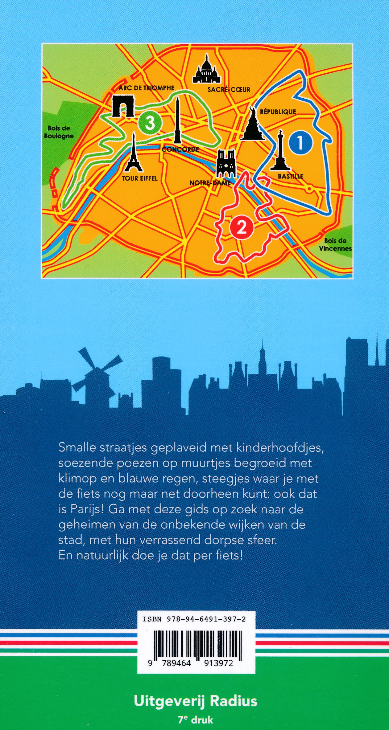 In deze gids beschrijft Joke Radius drie fietstochten door Parijs die langs water, parken, kerkhoven en boulevards gaan, over voormalige spoorwegtracés en door heel smalle straatjes. Naast veel café-terrassen zijn langs de route ook musea en aparte bezienswaardigheden aangegeven. Zo komt u in het nieuwe Parc de Bercy en het klassieke Parc de Monceau, fietst u langs het ‘Namaakmuseum’ en door het openluchtmuseum langs de Seine en ziet u de Parijse moskee en de Russische kathedraal.
