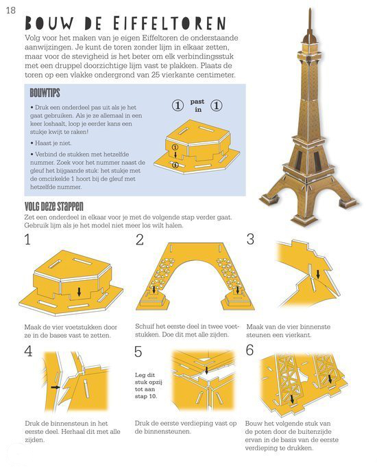 Bouw je eigen Eiffeltoren is een uniek doe-boek voor kinderen. Nadat je eerst alles over de Eiffeltoren in Parijs gelezen hebt, is het natuurlijk leuk om dit bijzondere bouwwerk zelf te maken. Dat kan met het bouwpakket in dit boek, waarmee je een Eiffeltoren van maar liefst 60 centimeter hoog kunt bouwen. Je komt veel te weten over de geschiedenis en de bouw van de Eiffeltoren. Door wie is de Eiffeltoren bedacht? Hoe zag Parijs er uit in die tijd? Wat is er allemaal rond de Eiffeltoren gebeurd? Lees alles over de Eiffeltoren en bouw hem zelf!