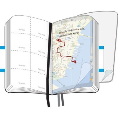 Each pocket sized Moleskine City Notebook is thread bound and has a cardboard bound cover with rounded corners acid free paper three bookmarks an elastic closure and an expandable inner pocket that contains the Moleskine history.