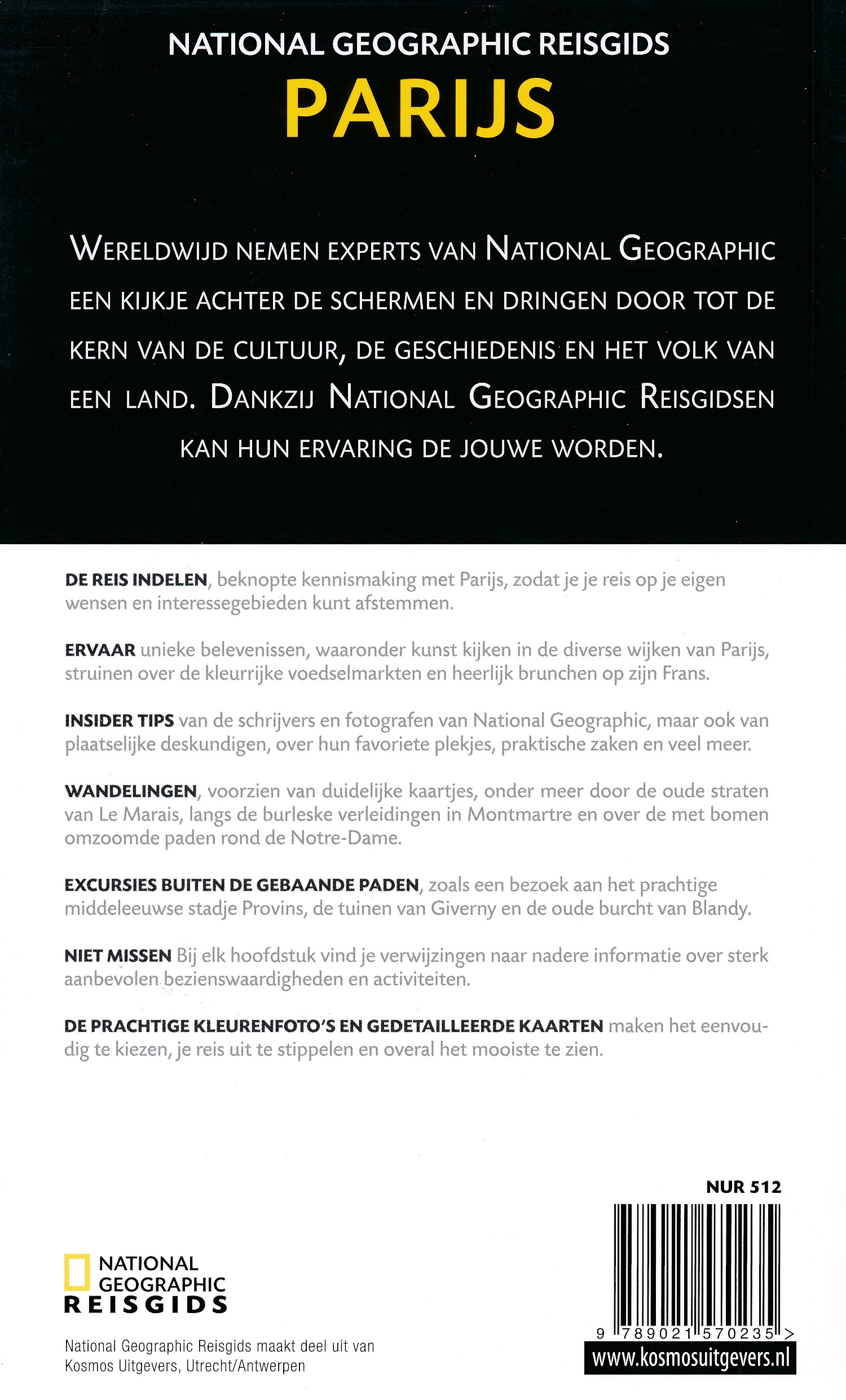National Geographic Reisgids Parijs is een exclusieve gids met sublieme fotografie die u meeneemt naar de bekende en minder bekende bezienswaardigheden. De experts van National Geographic nemen een kijkje achter de schermen en dringen door tot de kern van de cultuur, de geschiedenis en bijzondere plekjes van de stad.