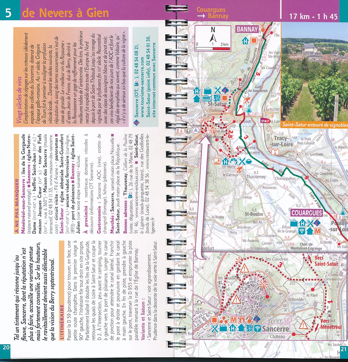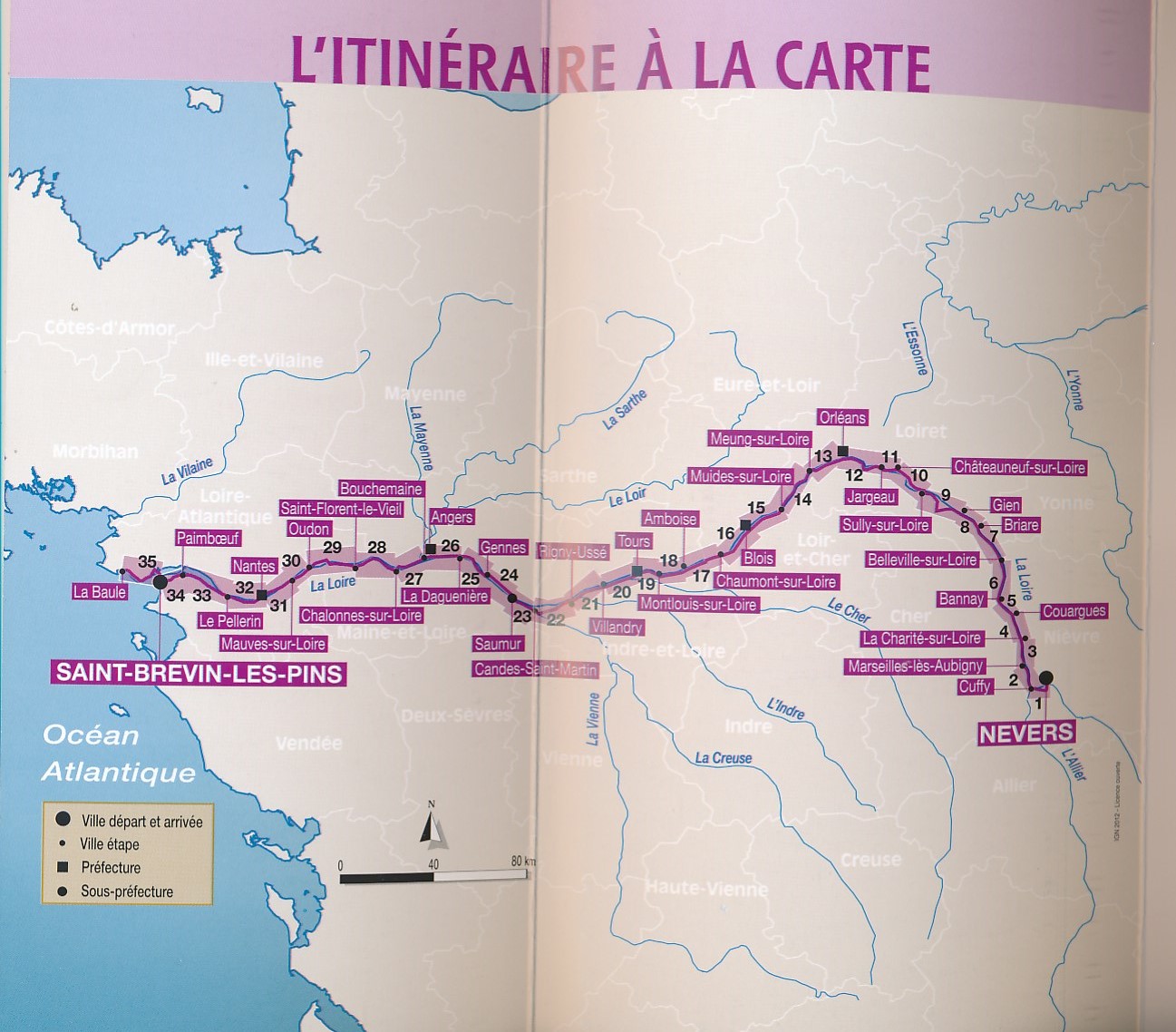 Een franstalige fietsgids voor 680 km fietsplezier. Vanaf Nevers volg je de Loire via Orléans, Blois, Tours en Nantes. Heldere kaarten waarop veel handige informatie staat aangegeven zoals overnachtingsplekken, boodschapadressen (zowel streekproduct als supermarkt) als ook zwemplekken, architectuur en grotten. De begeleidende tekst is kort qua fietsomschrijving, de kaart spreek voor zich. Wel staan er handige weetjes in zoals wanneer er markt is in de dorpen van de betreffende kaart, of welke wijnen bij de streek horen. Mooie gids, duidelijk vormgegeven en ook als je alleen een beetje basis Frans spreekt is de gids goed te begrijpen.