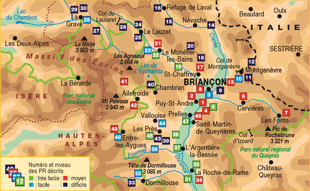 La Grave, Névache, Montgenèvre, Serre-Chevallier, Izoard, Galibier sont autant de noms qui sentent bon les vacances. Seul, le randonneur appréciera les longues vallées ponctuées de gorges ou bordées d'alpages multicolores en été, savourera un instant de bonheur et de quiétude au bord d'un des innombrables lacs ou encore s'émerveillera devant les panoramas découverts en haut d'un sommet ou le long d'une crête, souvent coiffés par un ancien fort. Enfin, Briançon et son riche patrimoine, dont une partie a été classée au Patrimoine mondial l'UNESCO, mérite plus qu'un détour.