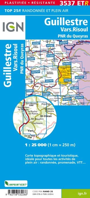 L'indispensable carte de randonnée IGN 3537ETR. D'une très grande précision elle contient tous les détails existants sur le terrain : voies de communication jusqu'au moindre sentier, constructions jusqu'au hangar, bois, arbre isolé, rivière, source... Sans oublier la représentation du relief par des courbes de niveau. Les sentiers balisés et les informations touristiques sont également représentées.