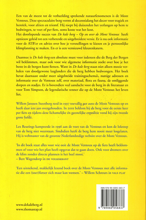 Het doorlopende succes van De kale berg – Op en over de Mont Ventoux heeft opnieuw geleid tot een verbeterde en uitgebreidere versie. Er is nu ook informatie voor de ATB’er en advies over hoe je versnellingen te kiezen en je persoonlijke klimplanning te maken. En er is een vernieuwd kleurenkatern.