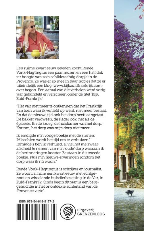 Een ruime kwart eeuw geleden kocht Renée Vonk-Hagtingius een paar muren en een half dak ter hoogte van zo'n schilderachtig dorpje in de Provence. Ze was er zo mee in haar nopjes dat ze er uiteindelijk een blog (www.kijkzuidfrankrijk.com) over begon. Een aantal van die verhalen werd vorig jaar gebundeld en verscheen onder de titel 'Kijk, Zuid-Frankrijk!' "Het valt niet meer te ontkennen dat het Frankrijk van toen waar ik verliefd op werd, niet meer bestaat. En dat de nieuwe tijd ook het dorp heeft aangetast. De bakker verdween, de slager ook, net als de épicerie. En de kroeg, de huiskamer van het dorp. Kortom, het dorp was mijn dorp niet meer. Ik eindigde m'n vorige boekje met de zinnen: 'Misschien wordt het tijd om te verhuizen.' Inmiddels bén ik verhuisd, al viel het me zwaar afscheid te nemen van m'n 'oude' dorp waaraan ik de herinneringen koester. Ze staan in dit tweede boekje. Plus m'n nieuwe ervaringen rondom het dorp waar ik nú woon." Renée Vonk-Hagtingius is schrijver en journalist. Ze woont al ruim een kwart eeuw met echtge- noot en wisselende huisdierbezetting in de Var, in Zuid-Frankrijk. Sinds begin dit jaar in een berg- gehuchtje in het onontdekte achterland van de 'Provence verte'.