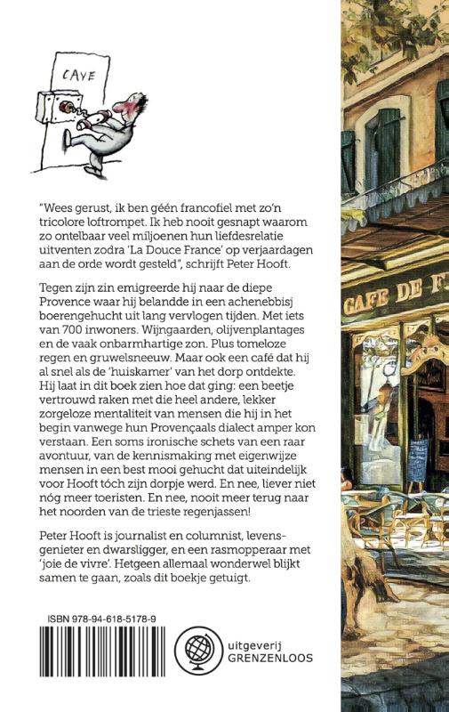 "Wees gerust, ik ben géén francofiel met zo'n tricolore loftrompet. Ik heb nooit gesnapt waarom zo ontelbaar veel miljoenen hun liefdesrelatie uitventen zodra 'La Douce France' op verjaardagen aan de orde wordt gesteld", schrijft Peter Hooft. Tegen zijn zin emigreerde hij naar de diepe Provence waar hij belandde in een achenebbisj boerengehucht uit lang vervlogen tijden. Met iets van 700 inwoners. Wijngaarden, olijvenplantages en de vaak onbarmhartige zon. Plus tomeloze regen en gruwelsneeuw. Maar ook een café dat hij al snel als de 'huiskamer' van het dorp ontdekte. Hij laat in dit boek zien hoe dat ging: een beetje vertrouwd raken met die heel andere, lekker zorgeloze mentaliteit van mensen die hij in het begin vanwege hun Provençaals dialect amper kon verstaan. Een soms ironische schets van een raar avontuur, van de kennismaking met eigenwijze mensen in een best mooi gehucht dat uiteindelijk voor Hooft tóch zijn dorpje werd. En nee, liever niet nóg meer toeristen. En nee, nooit meer terug naar het noorden van de trieste regenjassen! Peter Hooft is journalist en columnist, levensgenieter en dwarsligger, en een rasmopperaar met 'joie de vivre'. Hetgeen allemaal wonderwel blijkt samen te gaan, zoals dit boekje getuigt.
