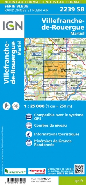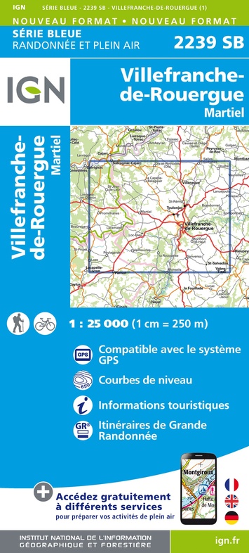 - Wandelkaart - Topografische kaart 2239 SB - Serie Bleue Villefranche-de-Rouergue, Martiel | IGN - Institut Géographique National