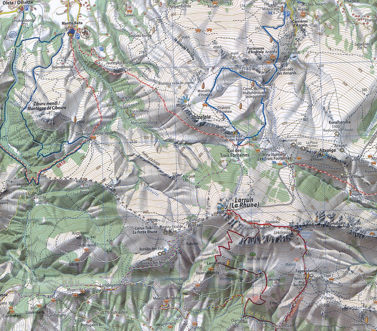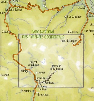 Mooie bijzonder gedetailleerde wandelkaart van een klein deel van de Pyreneeen. De wandelroutes zijn ingetekend, ook zijn met symbolen veel praktische zaken weergegeven als campings, hutten maar ook opvallende aspecten in het landschap.