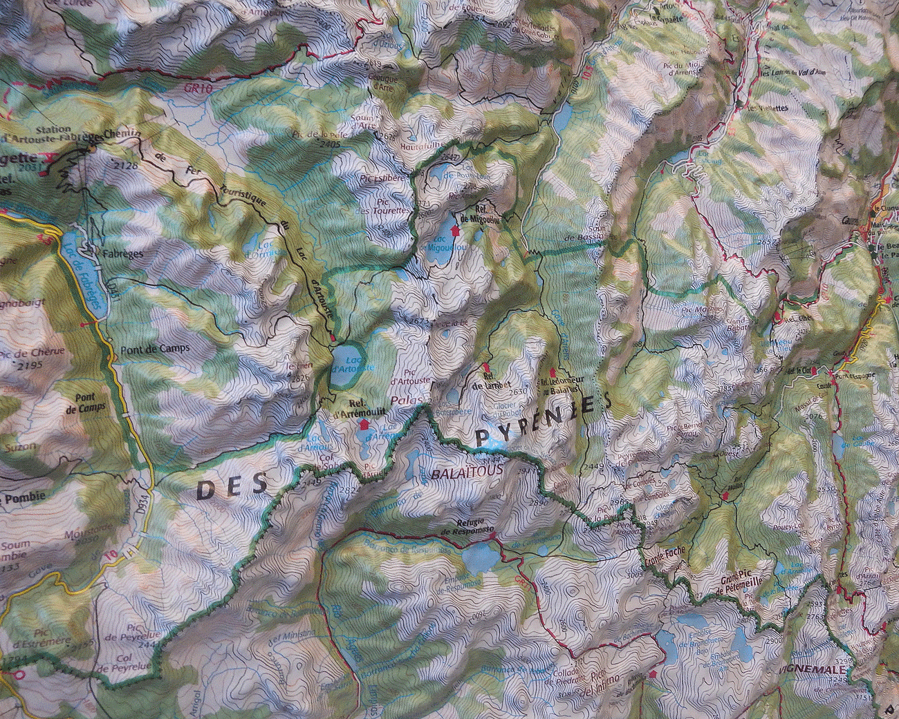 Prachtige 3D relief kaart van Pyreneen! Het kaartbeeld is gelijk aan die van de topografische kaarten van het Franse Cartografische instituut. Uitgevoerd in hard kunststof.