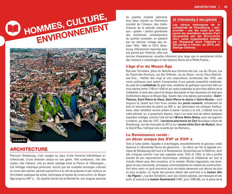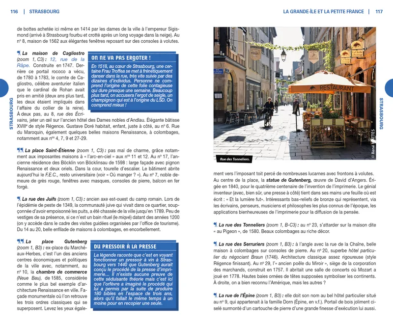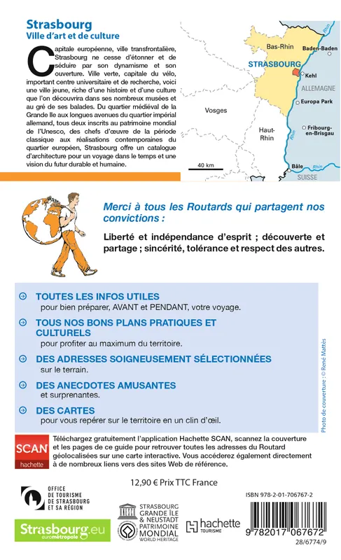 Risquer le torticolis à scruter tous les détails des façades de la cathédrale. S’arrêter, au hasard d’une des vieilles rues de la ville, pour une pause sucrée. S’offrir une expérience culinaire strasbourgeoise dans une des fameuses winstub. Se faire un joli trip architectural dans la Neustadt. Et pourquoi pas une balade urbaine à la nuit tombée sur la presqu’île Malraux. Après la visite du quartier des institutions européennes, se faire une petite escapade d’une journée en Suisse ou en Allemagne, histoire de vivre pleinement l’Europe !Le Routard Strasbourg est tout en couleur avec des photos et un plan détachable, pour découvrir plus facilement la ville et repérer nos coups de coeur ; tous nos bons plans ; des visites culturelles originales en dehors des sentiers battus ; des anecdotes surprenantes. Merci à tous les Routards qui partagent nos convictions : Liberté et indépendance d'esprit ; découverte et partage ; sincérité, tolérance et respect des autres.