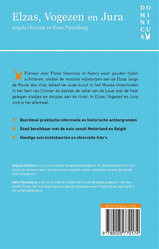 Ontdek Elzas, Vogezen en Jura op vakantie in Frankrijk met deze Dominicus-reisgids en verken Nancy, Verdun, Straatsburg, Colmar, Besançon en meer. Flaneer over Place Stanislas in Nancy waar gouden tijden schitteren, ontdek de mooiste wijndorpen van de Elzas langs de Route des Vins, beleef de oude kunst in het Musée Unterlinden in het hart van Colmar en bezoek de bezienswaardigheden in vallei van de Loue met de fraai gelegen stadjes en dorpjes aan de rivier. Beleef de ultieme vakantie In Elzas, Vogezen en Jura, regio’s die goed bereikbaar zijn met de auto vanuit Nederland en België. Deze reisgids zit boordevol praktische informatie, historische achtergronden, handige overzichtskaarten, sfeervolle foto’s en uitgebreide culturele achtergrondinformatie, is altijd up-to-date en geschreven door Nederlandstalige experts. Angela Heetvelt is al jaren fulltime reisgidsenschrijfster. De Elzas behoort tot haar favoriete streken, waar ze vooral voor muziek, kunst, wandelen en wijn geregeld naar terugkeert. Hans Pijnenburg is direct of indirect altijd met Frankrijk bezig geweest: met een studie Frans, het schrijven van een aantal reisgidsen over Frankrijk en zijn werk in de campingindustrie.Reviews