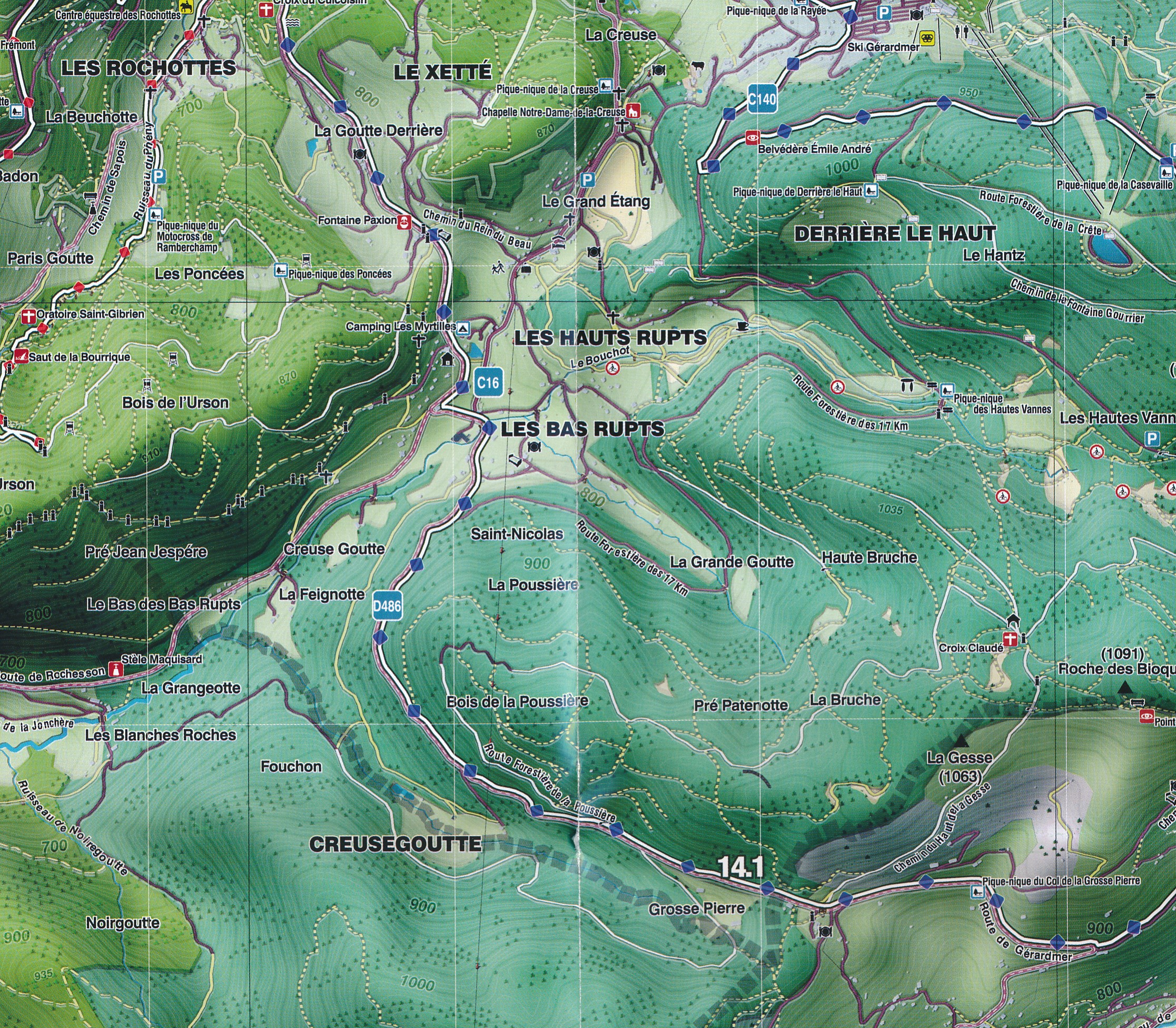 Wandelkaart van het Gerardmer in Vogezen, Frankrijk. De randen van de kaart zijn voorzien van bezienswaardigheden, werkt een beetje storend, maar verder een redelijke wandelkaart. Kleurstelling is wel redelijk donker, waardoor de leesbaarheid soms wat te wensen overlaat.
