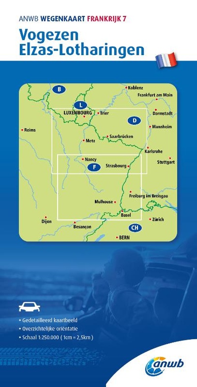 ANWB wegenkaarten zijn een begrip in het land. Dat laten de verkoopcijfers ook zien. Afgelopen decennia zijn meer dan 10 miljoen kaarten over de toonbank gegaan. De wegenkaarten zijn allemaal vernieuwd, met dikker karton voor de omslagen en papier dat minder makkelijk scheurt, zodat ze veelvuldig in- en uitgevouwen kunnen worden. Ze bieden een duidelijker overzicht van het wegennet en zijn nu nog compacter en handzamer. Met de gedetailleerde en nauwkeurige ANWB Wegenkaart Frankrijk 7. Vogezen, Elzas-Lotharingen ga je goed voorbereid op autovakantie. Schaal van 1:250.000 (1 cm = 2,5 km).