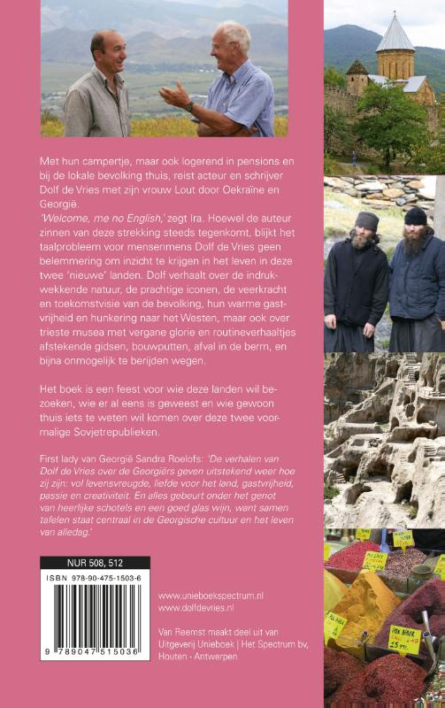 Oekraine en Georgie in een rugzak - Met hun campertje, maar ook logerend in pensions en bij de lokale bevolking thuis, reist acteur en schrijver Dolf de Vries met zijn vrouw Lout door Oekraïne en Georgië. ‘Welcome, me no English,' zegt Ira. Hoewel de auteur zinnen van deze strekking steeds tegenkomt, blijkt het taalprobleem voor mensenmens Dolf de Vries geen belemmering om inzicht te krijgen in het leven in deze twee ‘nieuwe' landen. Dolf verhaalt over de indrukwekkende natuur, de prachtige iconen, de veerkracht en toekomstvisie van de bevolking, hun warme gastvrijheid en hunkering naar het Westen, maar ook over trieste musea met vergane glorie en routineverhaaltjes afstekende gidsen, bouwputten, afval in de berm, en bijna onmogelijk te berijden wegen.