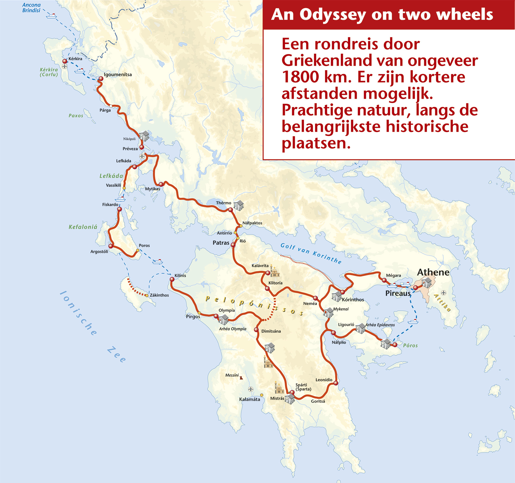 Een rondreis door Griekenland van ongeveer 1800 km. Er zijn kortere afstanden mogelijk. Prachtige natuur, langs de belangrijkste historische plaatsen. Deze 112 pagina's dikke gids is in 2 talen geschreven (Engels en Nederlands) en is weer volledig actueel. Daarbij is er een uitgebreide overnachtingslijst aan de gids toegevoegd.