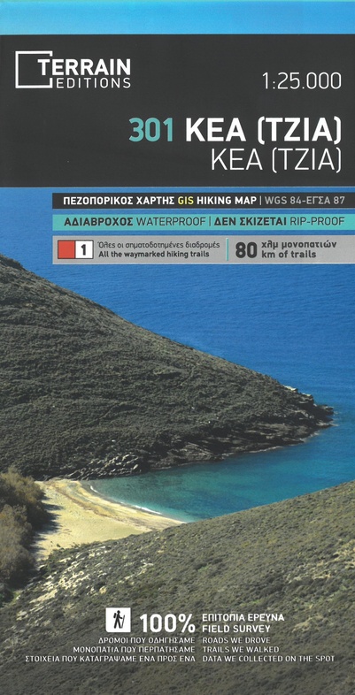 Erg goede wandelkaart van Tzia, weerbestendig en volledig. Bezienswaardigheden, campings en andere praktische zaken staan op de kaart aangegeven. GPS toepasbaar.