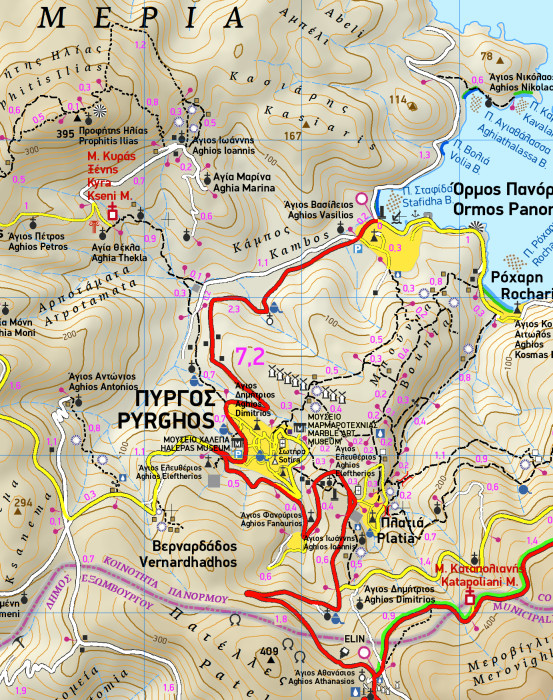 - It features the most current city map, wherein lies the heart of the island nightlife and fun. All bars (through May 2009) are marked on the map along with restaurants, hotels, sights and a whole lot of other points of interest. It also features the most complete road network, including all roads leading to the hotels and private villas at even the tiniest corners of the island, and the most important trails of Rineia for the first time ever in Greek cartography.